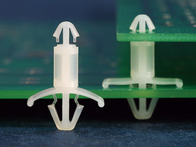 Dual locking support post. Arrowhead top for 3.5 mm panel hole and arrowhead with tension wing for 4.8 mm chassis hole. Standoff height is 25 mm.