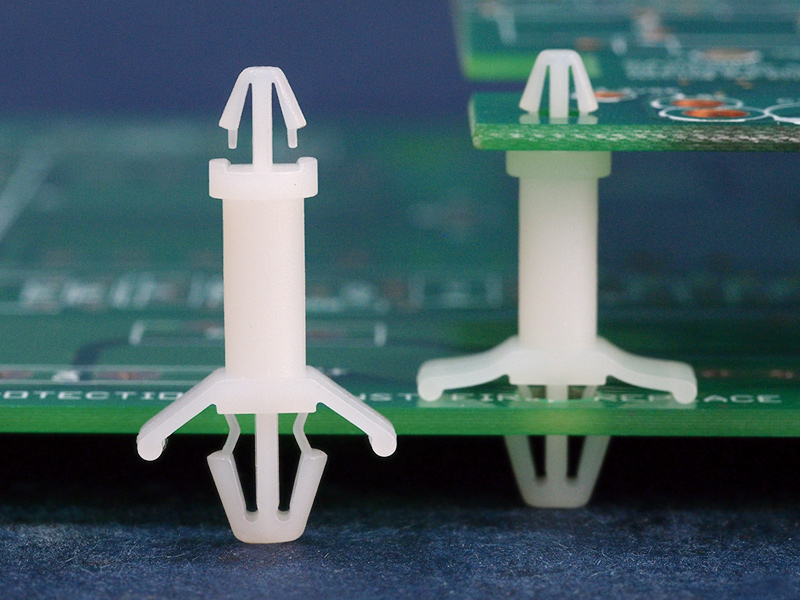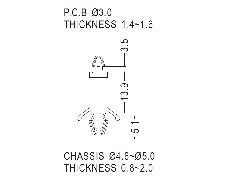 Dual locking support post. Arrowhead top for 3 mm panel hole and arrowhead with tension wing for 4.8~5 mm chassis hole. Standoff height is 13.9 mm.