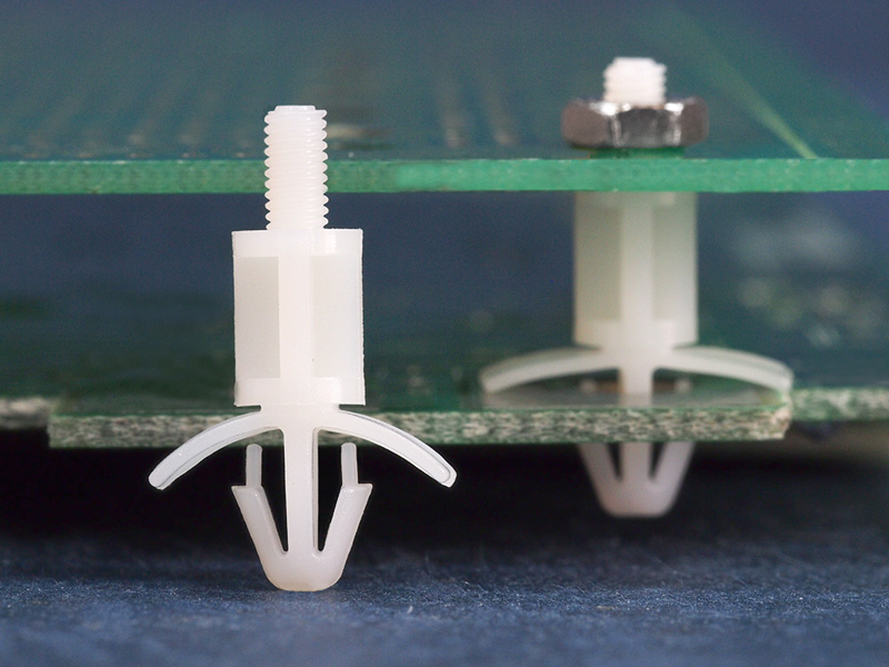 Male threaded snap lock. M3 thread top and arrowhead with tension wing for 4.8 mm chassis hole. Standoff height is 10 mm.