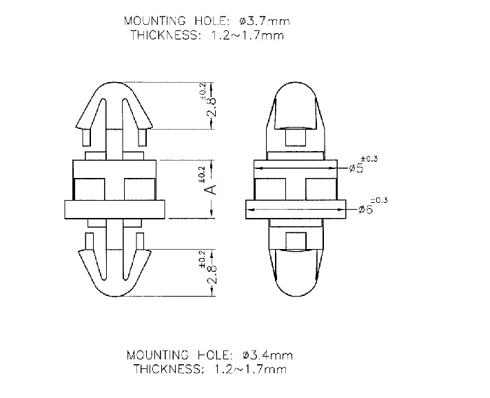 Arrowhead support post for a panel top hole of 3.4 mm and a bottom hole of 3.7 mm. Standoff height is 3.5 mm.
