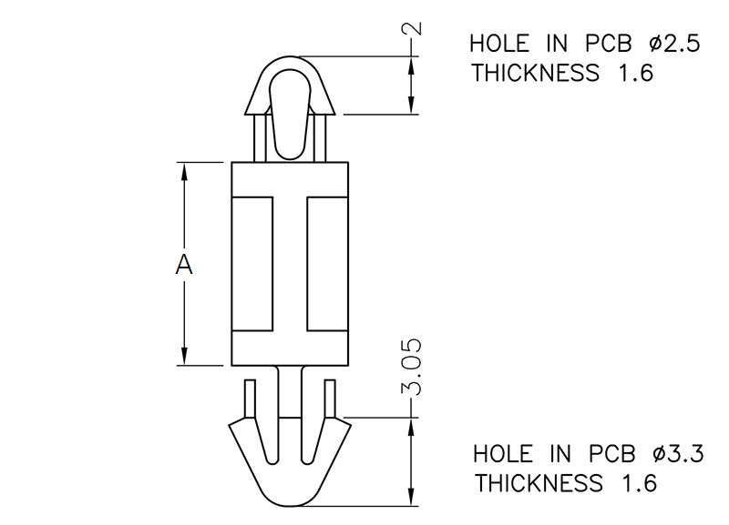 Dual snap lock support. Snap lock teardrop fits in a 2.5 mm panel hole and an arrowhead fits a chassis hole of 3 mm. Spacer length is 7 mm.
