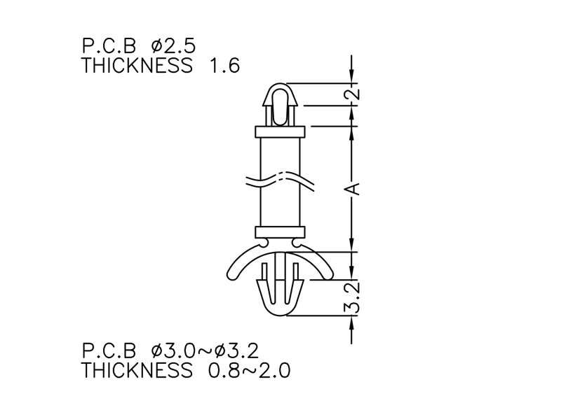 Dual locking support post. Snap lock top for 2.5 mm panel hole and arrowhead with tension wing for 3~3.2 mm chassis hole. Standoff height is 3.2 mm.