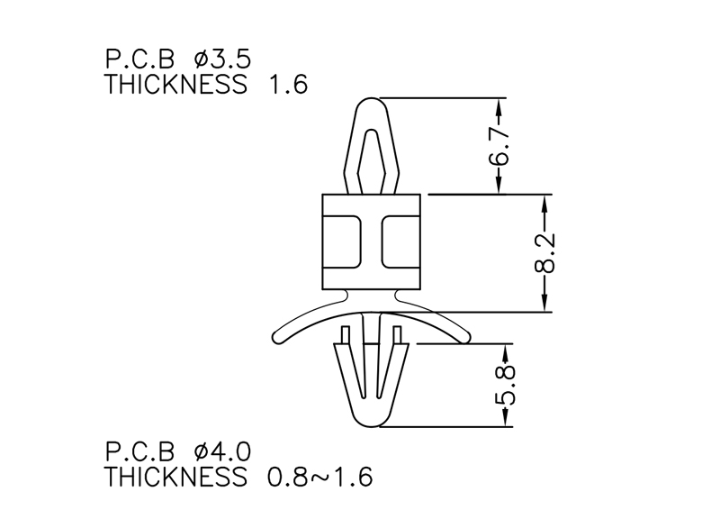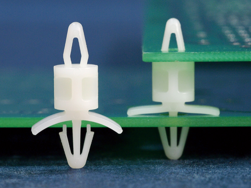 Dual locking support post. Snap lock teardrop for top hole of 3.5 mm and arrowhead with tension wing for 4 mm chassis hole. Standoff height is 8.2 mm.