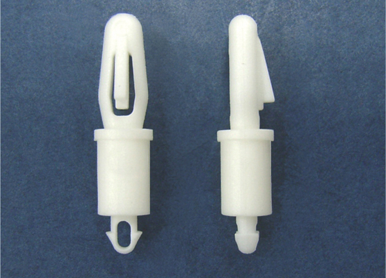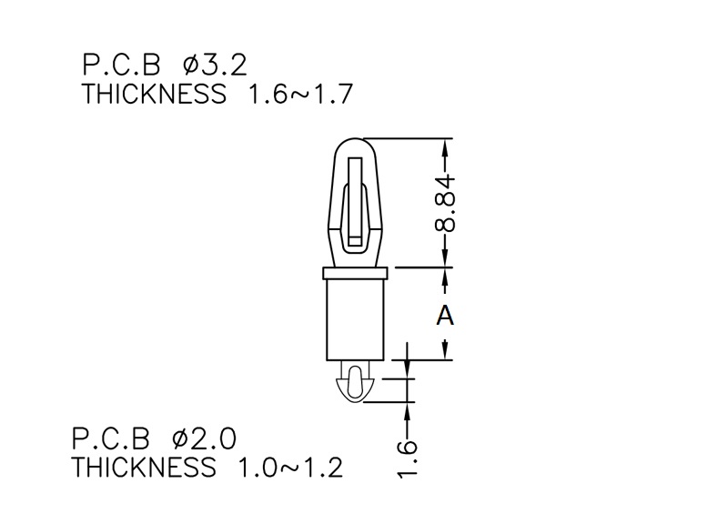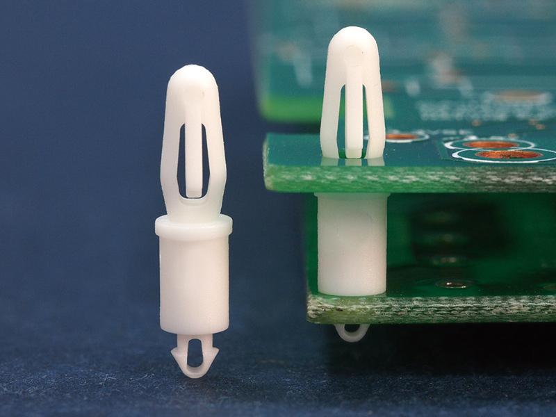 Dual lock support post. Bayonet snap fit for a top hole of 3.2 mm and a teardrop design for a chassis hole of 2 mm. Standoff height is 6.4 mm.