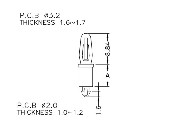 Dual lock support post. Bayonet snap fit for a top hole of 3.2 mm and a teardrop design for a chassis hole of 2 mm. Spacer length is 6.4 mm.