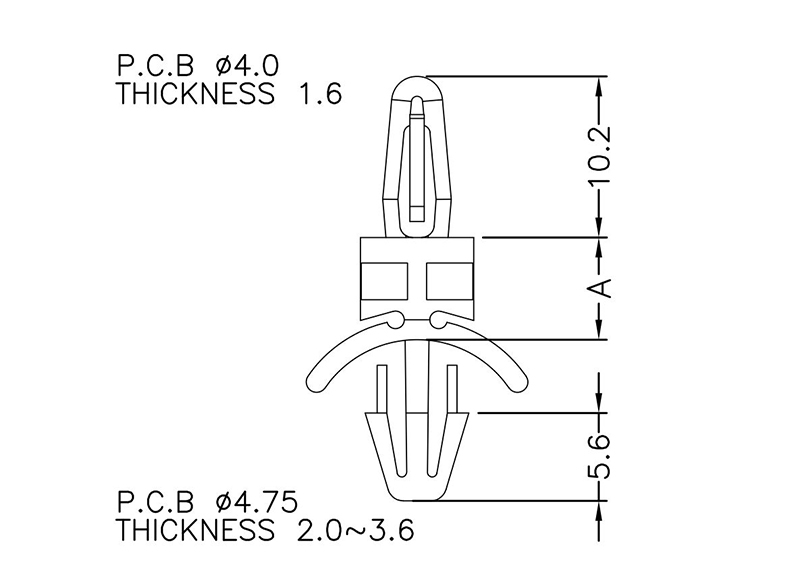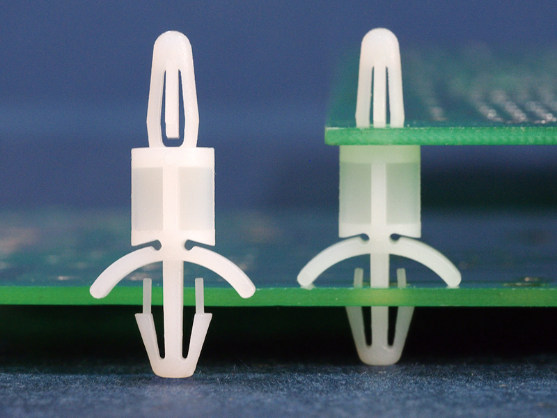 Dual locking support post. Bayonet snap fit for top hole of 4 mm and arrowhead with tension wing for a 4.75 mm chassis hole. Standoff height is 6.4 mm.