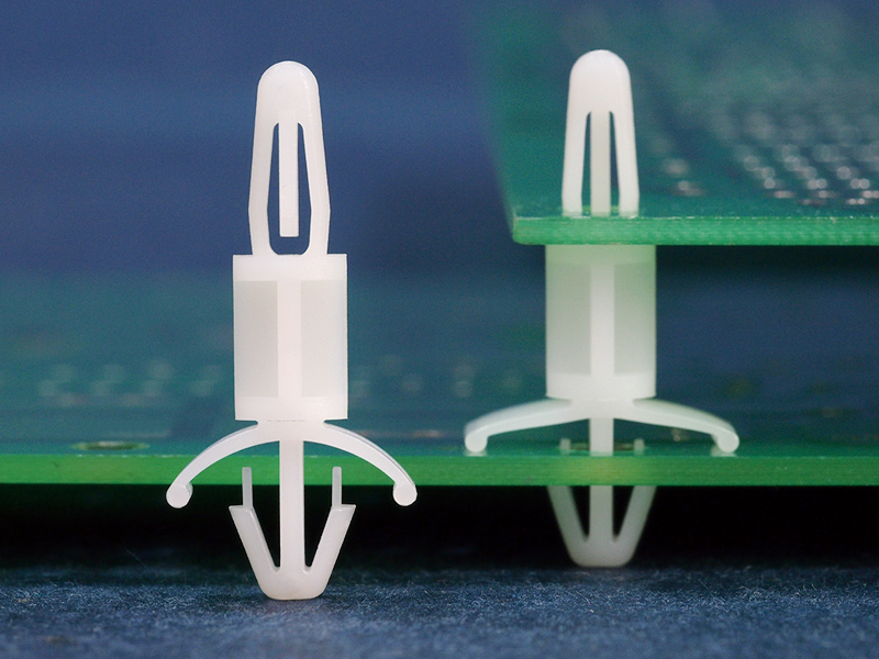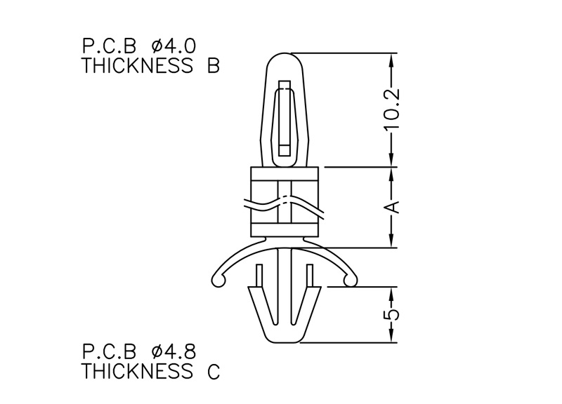Dual locking support post. Bayonet snap fit for top hole of 4 mm and arrowhead with tension wing for a 4.8 mm chassis hole. Standoff height is 4.8 mm.