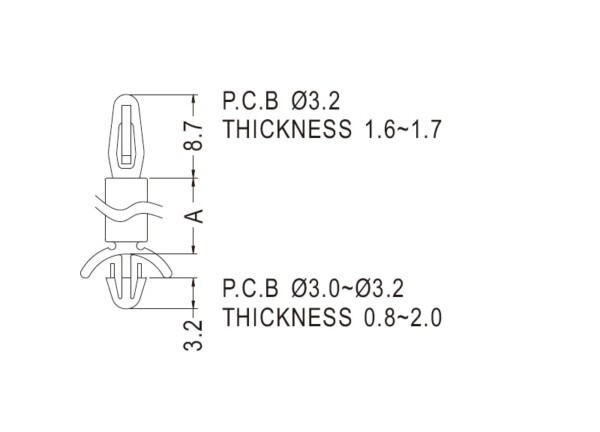 Dual locking support post. Bayonet snap fit for top hole of 3.2 mm and arrowhead with tension wing for 3~3.2 mm chassis hole. Spacer length is 3.2 mm.
