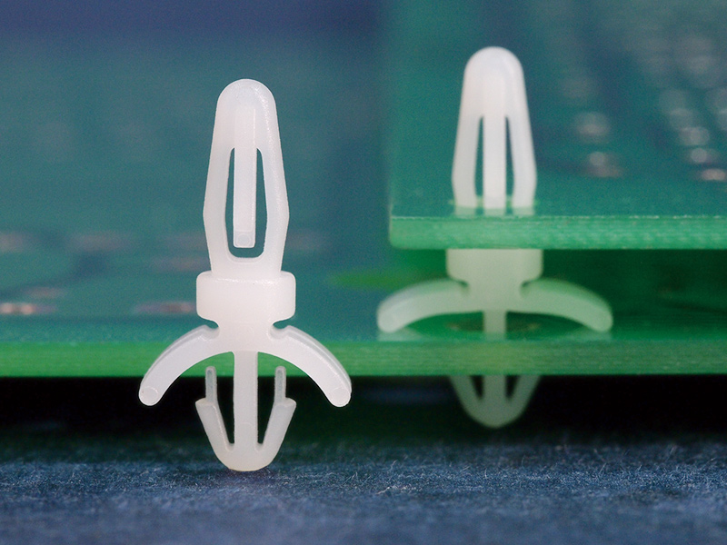 Dual locking support post. Bayonet snap fit for top hole of 3.2 mm and arrowhead with tension wing for 3~3.2 mm chassis hole. Standoff height is 4.8 mm.