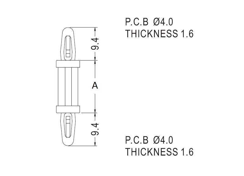 Dual lock support post. Bayonet snap fit for a top and bottom hole of 4 mm. Spacer length is 15 mm.