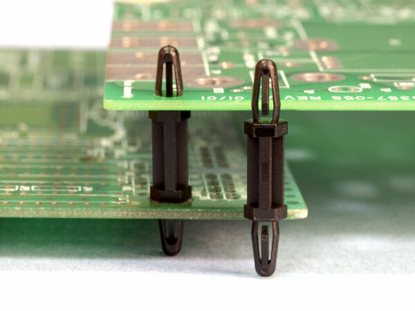 Dual lock support post. Bayonet snap fit for a top and bottom hole of 4 mm. Spacer length is 15 mm.