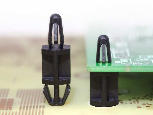 Dual locking support post. Snap lock for top hole of 4 mm and a two prong snap lock for 5.4 mm chassis hole. Standoff height is 9.7 mm.