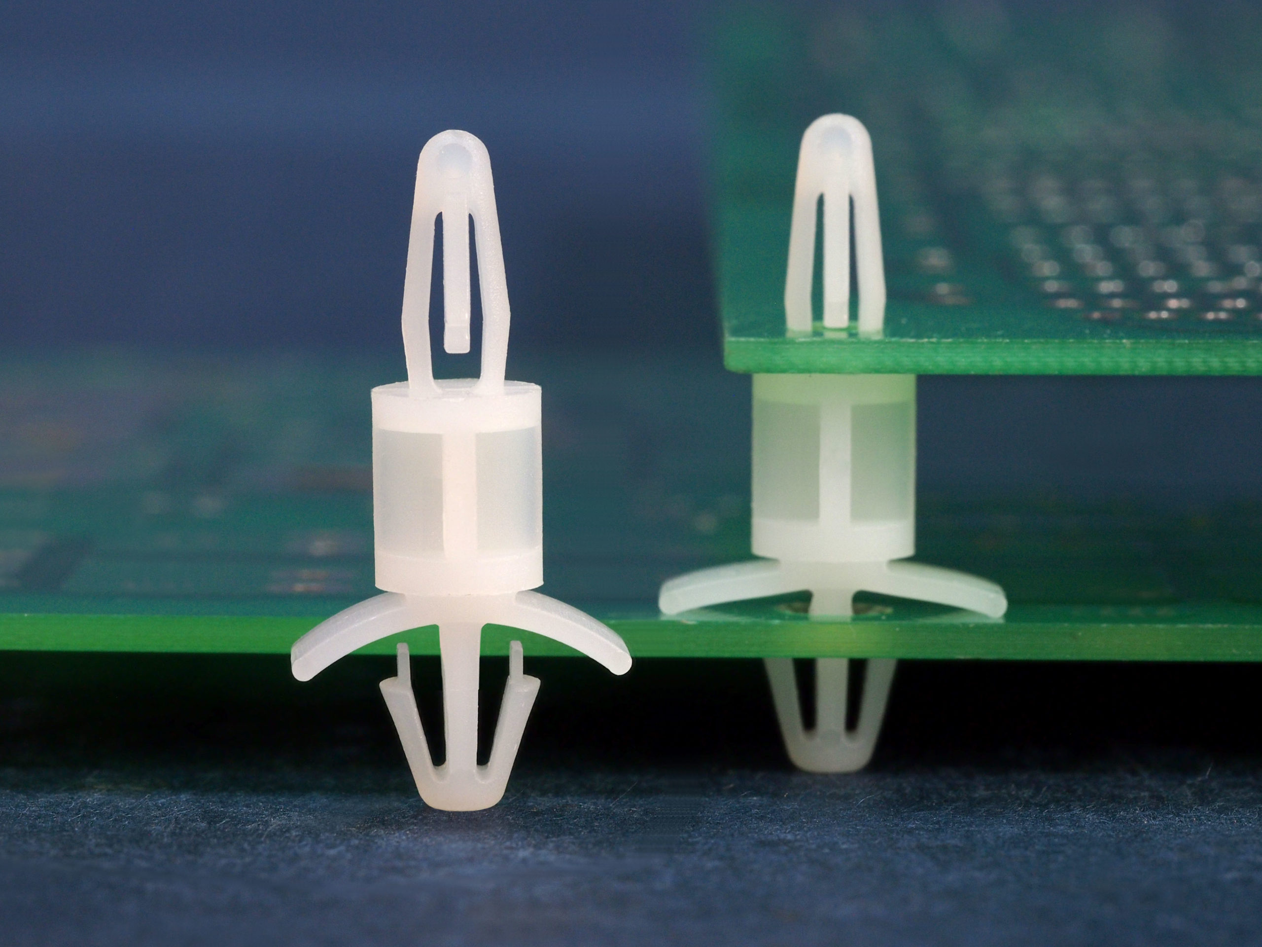 Dual locking support post. Bayonet snap fit for top hole of 4 mm and arrowhead with tension wing for 4.8 mm chassis hole. Spacer length is 9.5 mm.