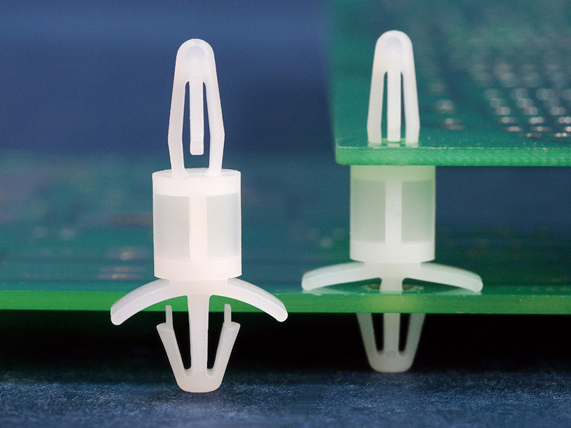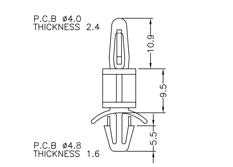 Dual locking support post. Bayonet snap fit for top hole of 4 mm and arrowhead with tension wing for 4.8 mm chassis hole. Standoff height is 9.5 mm.