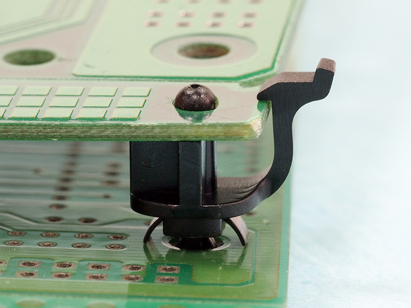 Spacer Edge Flat Rest Snap Fit arrowhead with tension wings. Nylon 66. Color Natural/Black. Snap Fit hole dia. Ø4.8mm. Thickness 2.5-2.8mm .Top hole 3.0mm. Spacer Length 12.0mm