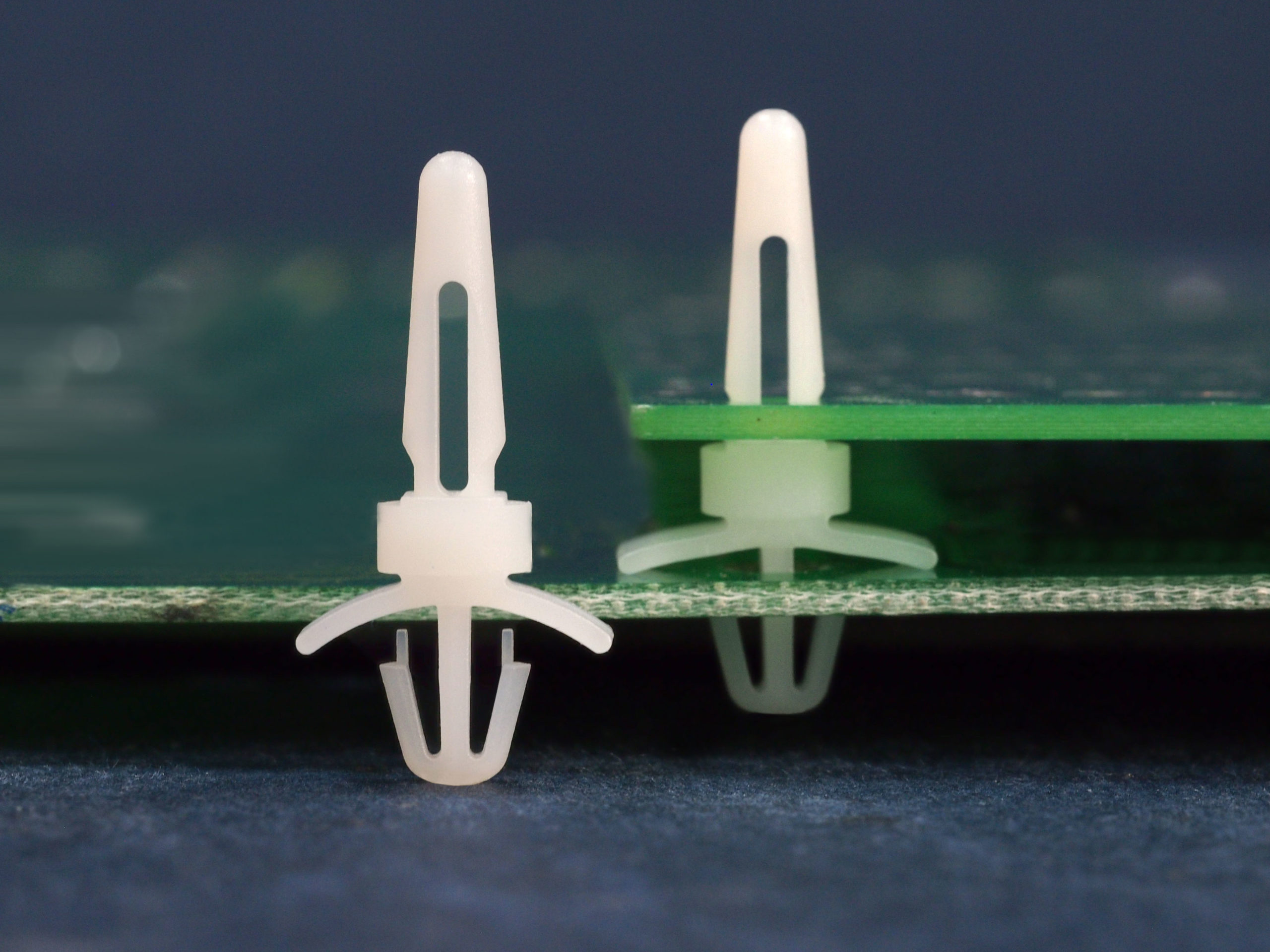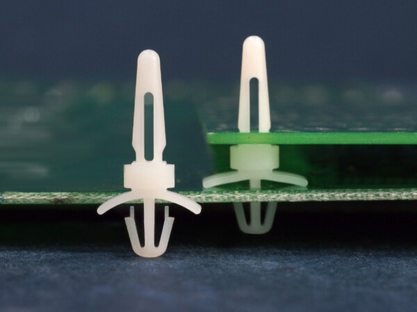 Dual locking support post. Snap lock for top hole of 4 mm and arrowhead with tension wing for 4.8 mm chassis hole. Spacer length is 4.8 mm.