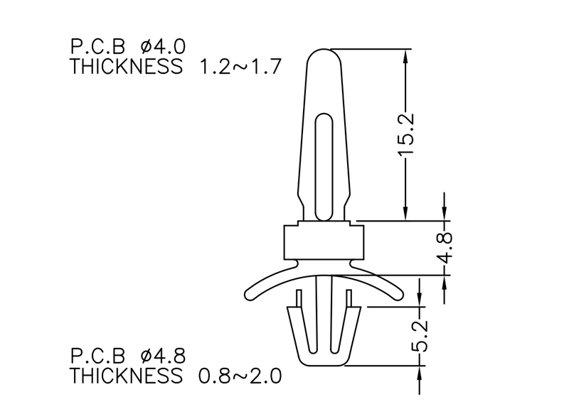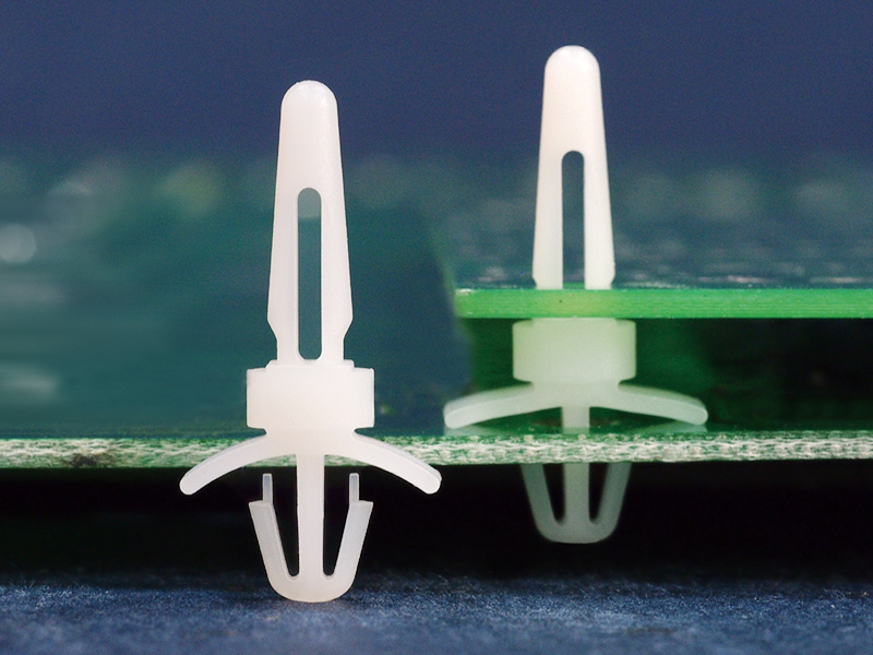 Dual locking support post. Snap lock for top hole of 4 mm and arrowhead with tension wing for 4.8 mm chassis hole. Standoff height is 4.8 mm.