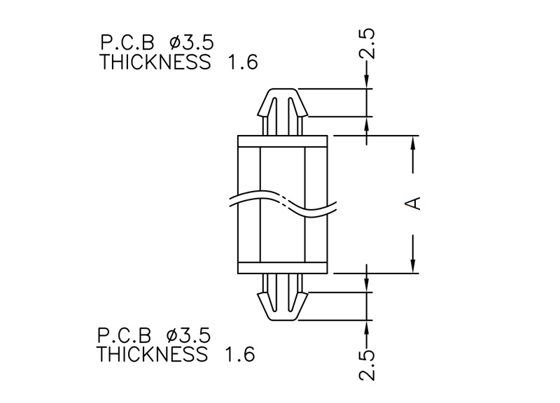 Arrowhead support post for a panel top and a bottom hole of 3.5 mm. Standoff height is 33.53 mm.