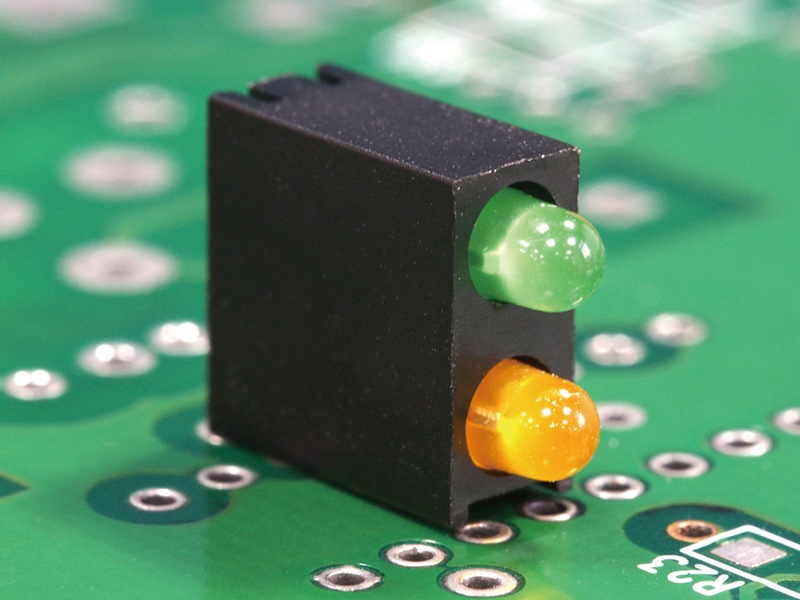 Right Angled vertical 2 stack LED holder for T-1 (3mm) LED. Centerline bottom LED 2.65mm. Centerline top LED 7.65mm. LED’s shown for Demo not included in holder