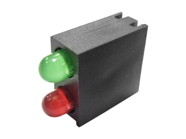 Right Angled vertical 2 stack LED holder for T-1 (3mm) LED. Centerline bottom LED 2.65mm. Centerline top LED 7.65mm. LED’s shown for Demo not included in holder