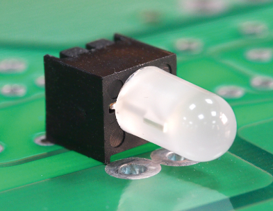 LED Holder PA66 Right Angle PCB Mount for 3 lead LED size 3mm(T-1). Centerline 5.0mm. Gives consistent height and support to LED. LED’s shown for Demo not included in holder