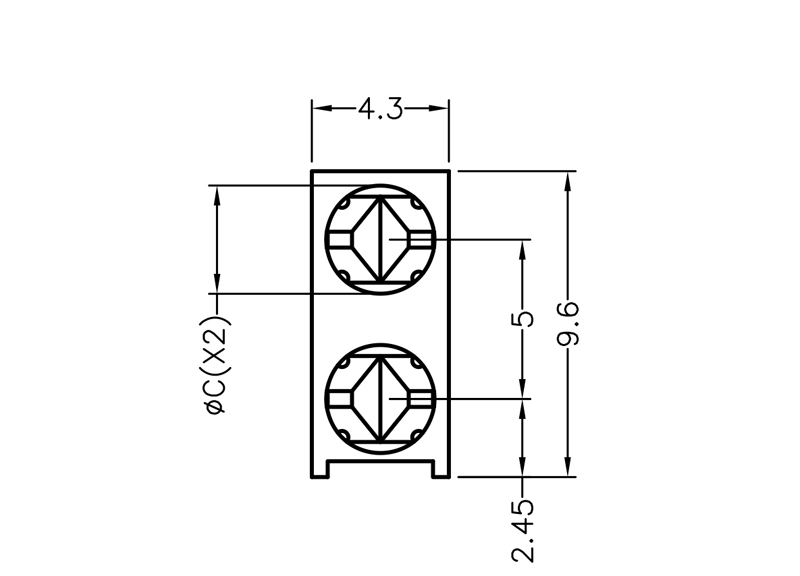 Right Angled vertical 2 stack LED holder for T-1 (3mm) LED. Centerline bottom LED 2.45mm. Centerline top LED 7.45mm. LED’s shown for Demo not included in holder