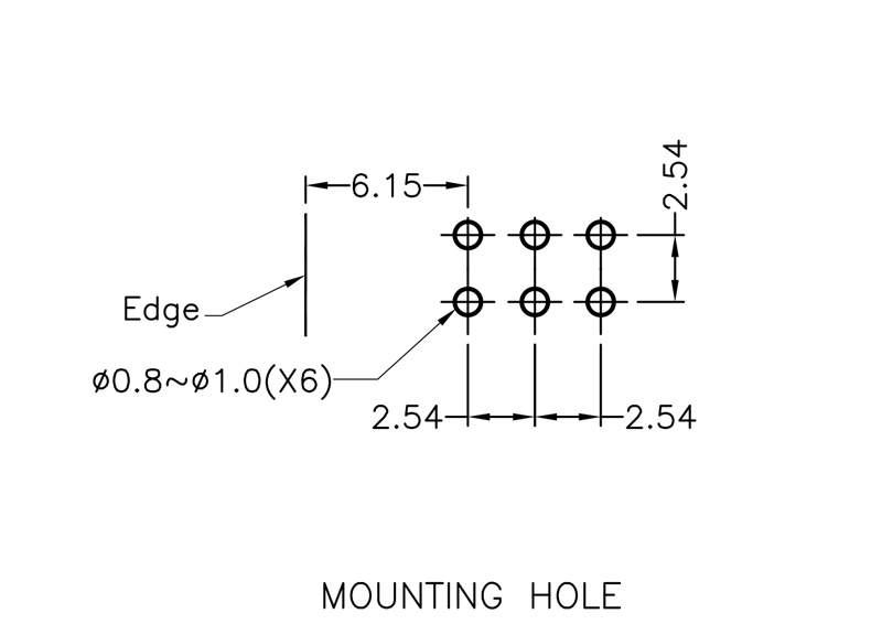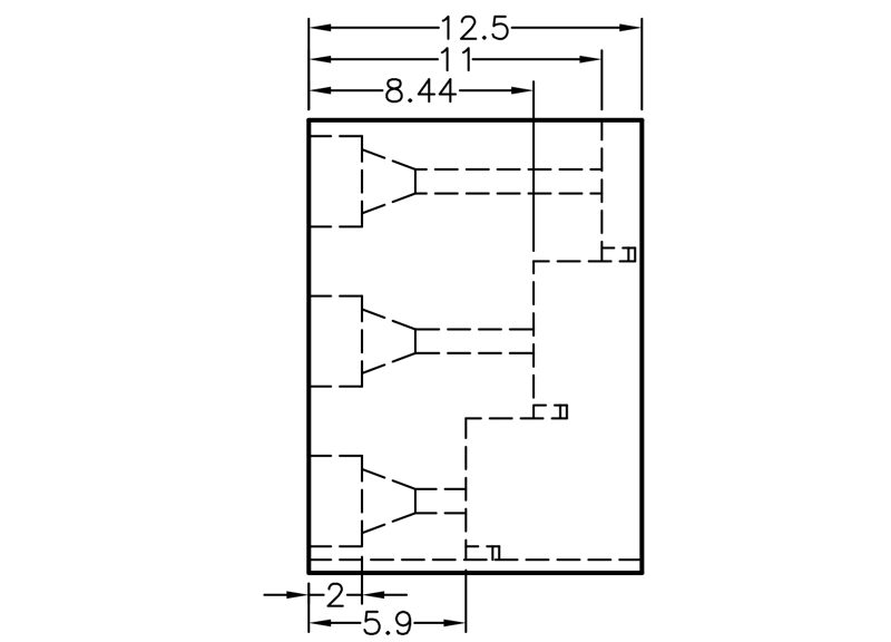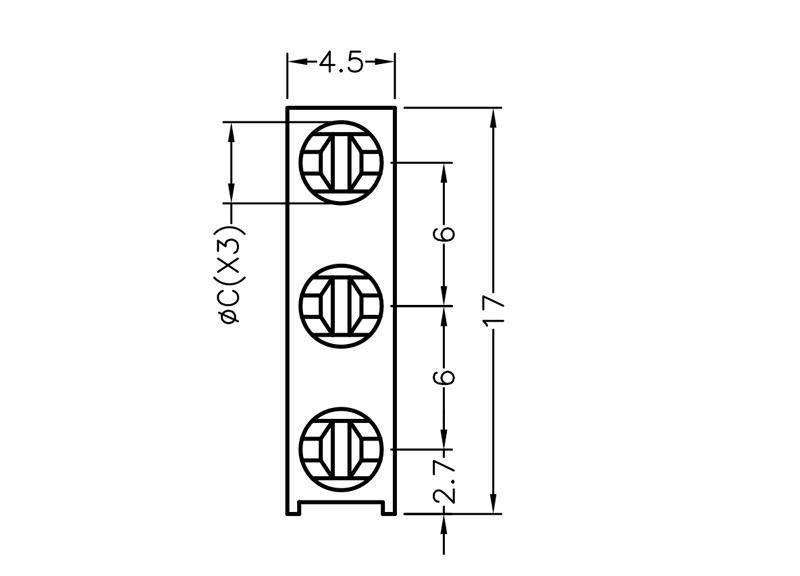 Right Angled 3 stack LED holder for LED size 3mm(T-1). Centerline bottom LED 2.7mm. Distance between LED’s 6.0mm. LED’s shown for Demo not included in holder
