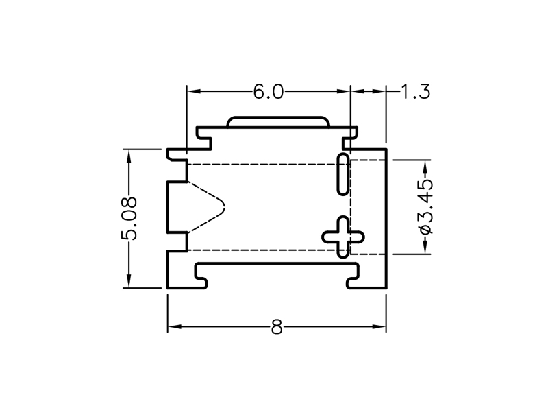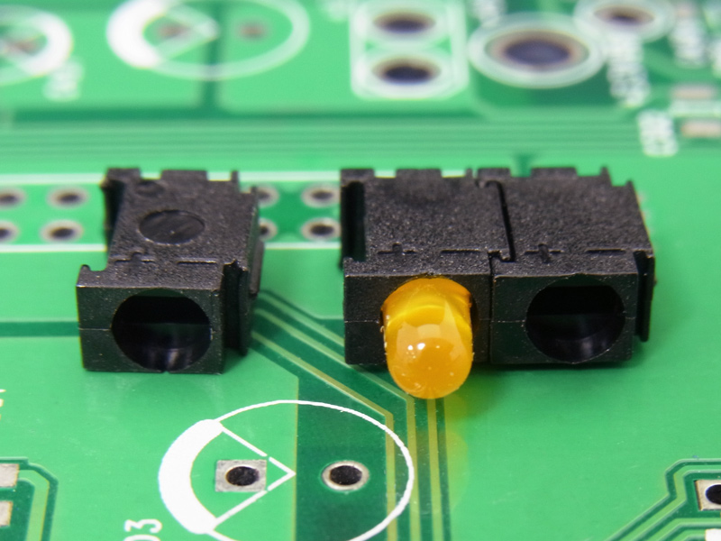 LED Holder PA66 Right Angle PCB Mount for LED size 3mm(T-1) with Interlocking feature. Centerline 2.96mm. The Interlocking feature creates a LED holder array . LED’s shown for Demo not included in holder