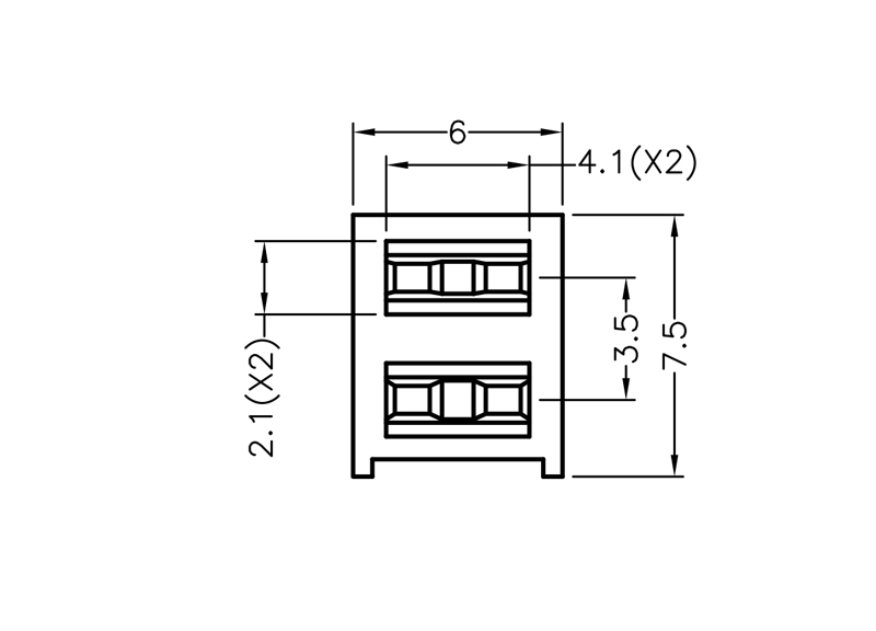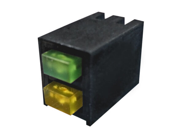 Right Angled vertical 2 stack LED holder for Rectangular LED 3x2mm. Distance between LED’s 3.5mm. LED’s shown for Demo not included in holder