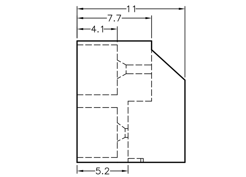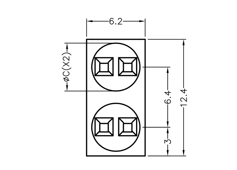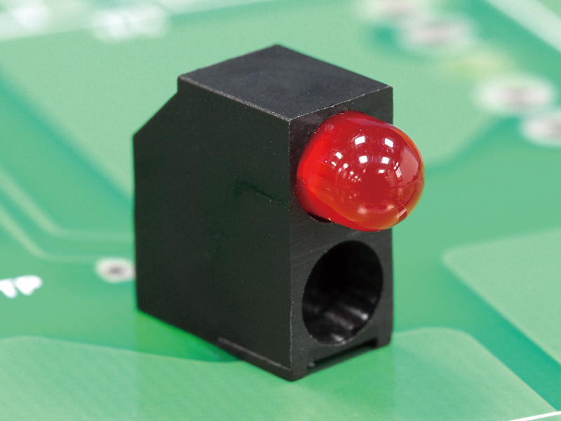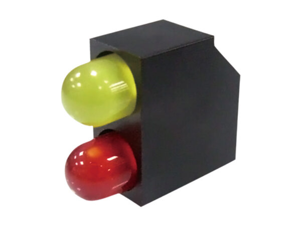 Right Angled vertical 2 stack LED holder for size 5mm(T-1¾) LED. Centerline bottom LED 3.0mm. Centerline top LED 9.4mm. LED’s shown for Demo not included in holder