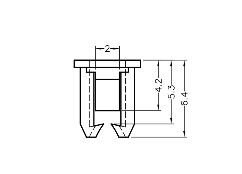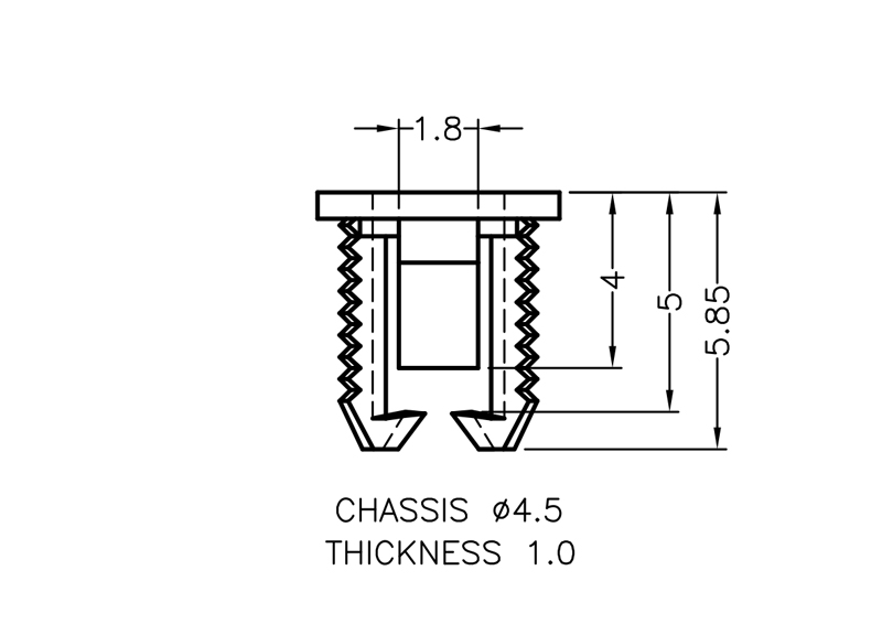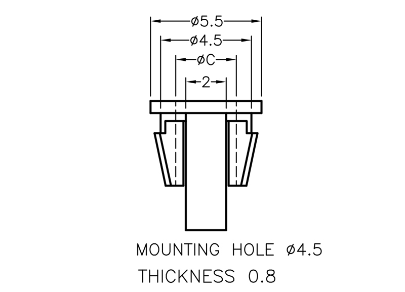 Snap In LED holder for LED size 3mm (T1). Chassis hole size Ø4.5mm. Chassis Thickness 0.8mm. Length protrusion 4.7mm. Material Nylon 66. Color Black