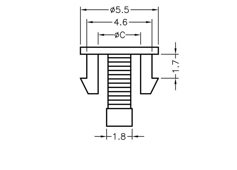 Snap In LED holder for LED size 3mm (T1). Chassis hole size Ø4.5mm. Chassis Thickness 1.6mm. Length protrusion 3.85mm. Material Nylon 66. Color Black