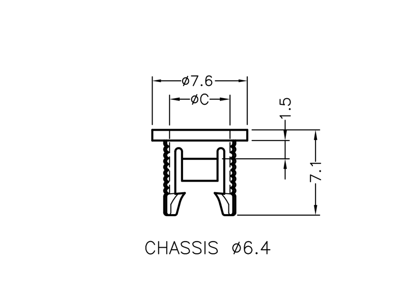 LED Snap-In Panel Mount housing for 5mm LED. Mounting Hole size Ø6.4mm. Panel Thickness 1.2mm. Material Nylon 66. Color Black