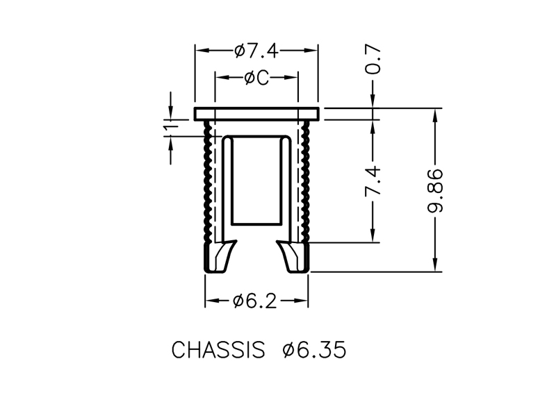 LED Snap-In Panel Mount housing for 5mm LED. Mounting Hole size Ø6.35mm. Panel Thickness 0.9mm. Material Nylon 66. Color Black. A separate locking ring (LED5-8T) is available to secure the LED holder
