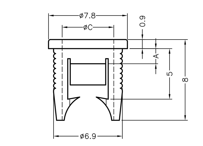 LED Snap-In Panel Mount housing for 5mm LED. Mounting Hole size Ø7.0mm. Panel Thickness 0.8-1.4mm. Material Nylon 66. Color Black