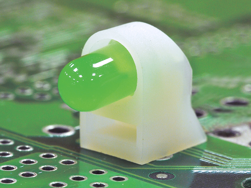 LED Holder PA66 Right Angle PCB Mount for 3 lead LED size 5mm(T-1¾) with 2 Centerpins. Centerline 11.0mm. The 2 Centerpins avoid the holder from turning and relieves the stress on the leads of the LED. LED’s shown for Demo, not included in holder