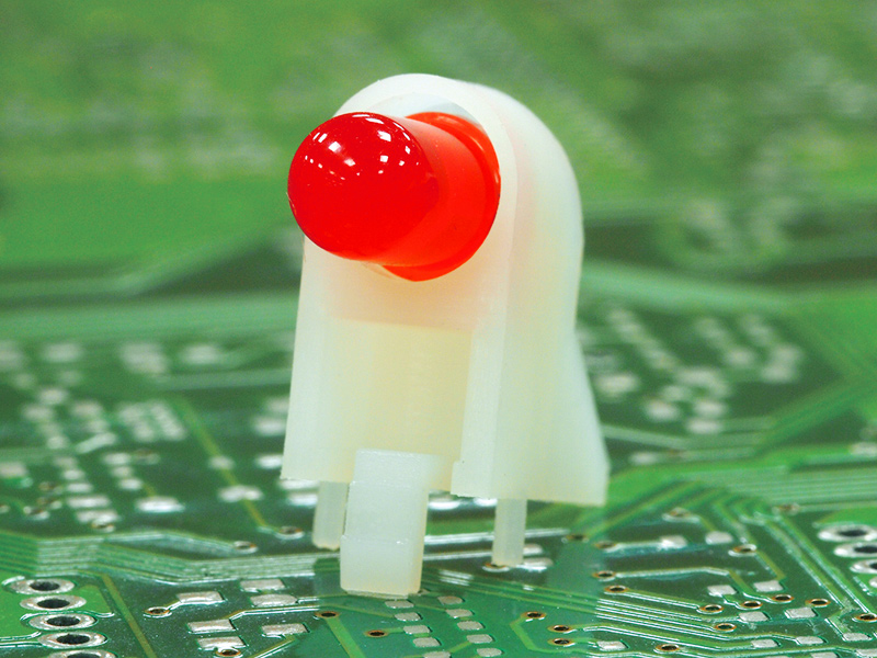 LED Holder PA66 Right Angle PCB Mount for 3 lead LED size 5mm(T-1¾) with Locking & 2 Centerpins. Centerline 7.0mm. The Locking & Centerpins avoid the holder from turning and relieves the stress on the leads of the LED. LED’s shown for Demo, not included in holder