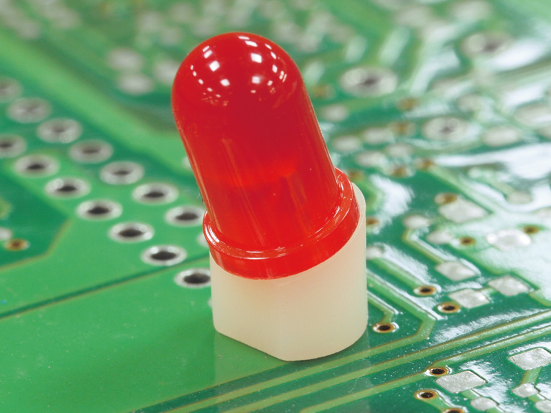 LED holder PA66 22 degree angle PCB Mount for LED size 5mm(T-1¾). Gives consistent height and support to LED. LED’s shown for Demo not included in holder