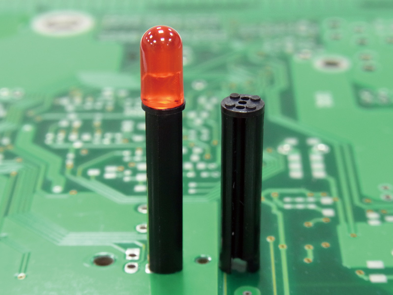 LED Spacer Mount for LED size 5mm (T-1¾) with a self-aligning feature to keep the leads separated. Length 21.8mm. Material PBT. Available in Natural and Black