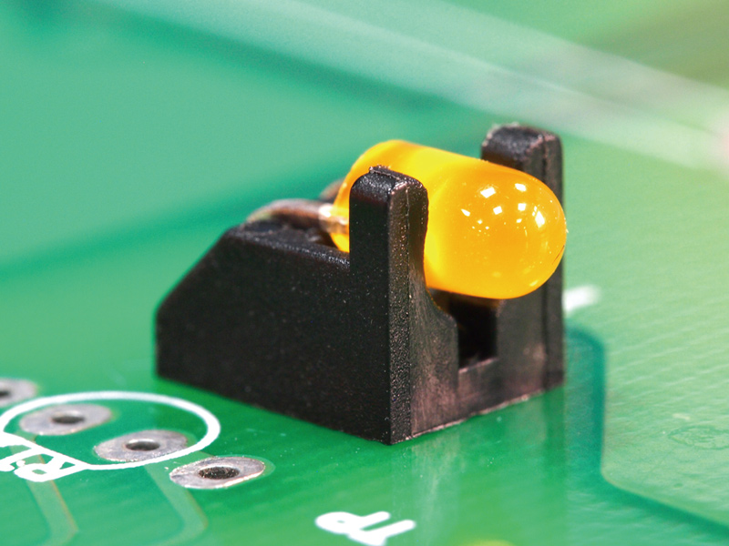 LED Support PA66 Right Angle PCB Mount for LED size 3mm(T-1) with 2 Centerpins. Centerline 5.0mm. The 2 Centerpins keep the holder in place and relieves the stress on the leads of the LED . LED’s shown for Demo not included in holder