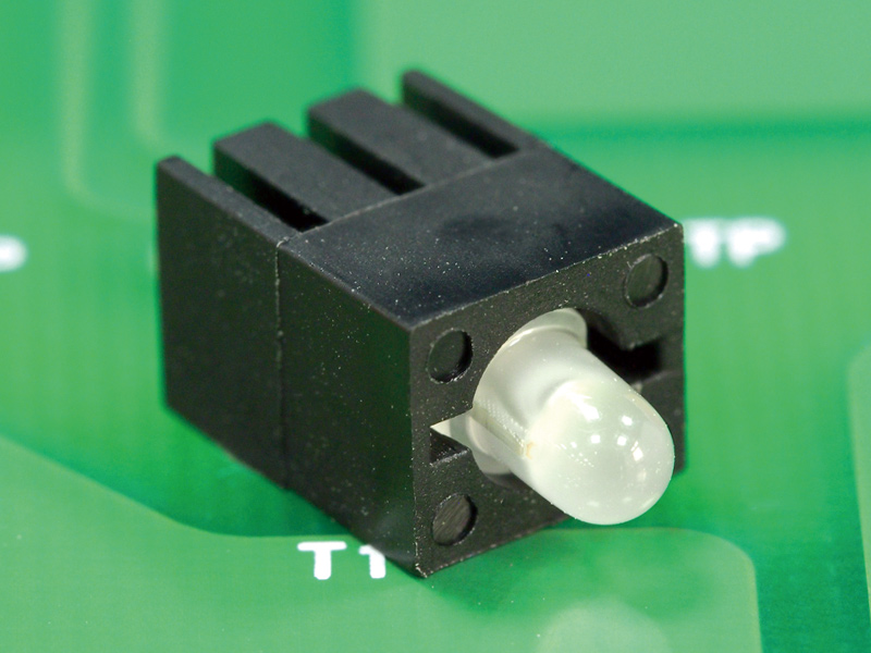 LED Holder PA66 Right Angle PCB Mount for 3 lead LED size 3mm(T-1) with Centerpin. Centerline 3.0mm. The Centerpin keeps the holder in place and relieves the stress on the leads of the LED . LED’s shown for Demo not included in holder