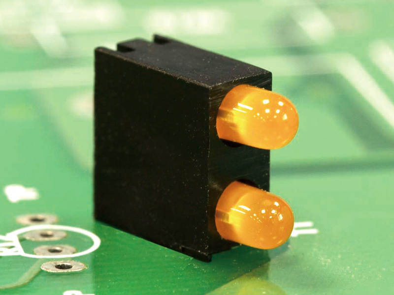 Right Angled vertical 2 stack LED holder for T-1 (3mm) LED with Locking pin. Centerline bottom LED 2.5mm. Centerline top LED 7.58mm. The Locking pin keeps the holder in place and relieves the stress on the leads of the LED. LED’s shown for Demo not included in holder