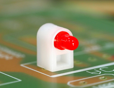 LED Support PA66 Right Angle PCB Mount for LED size 3mm(T-1) with 2 Centerpins. Centerline 8.0mm. The 2 Centerpins avoid the holder from turning and relieves the stress on the leads of the LED . LED’s shown for Demo, not included in holder
