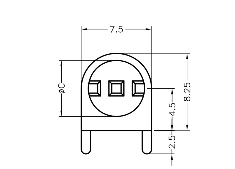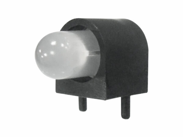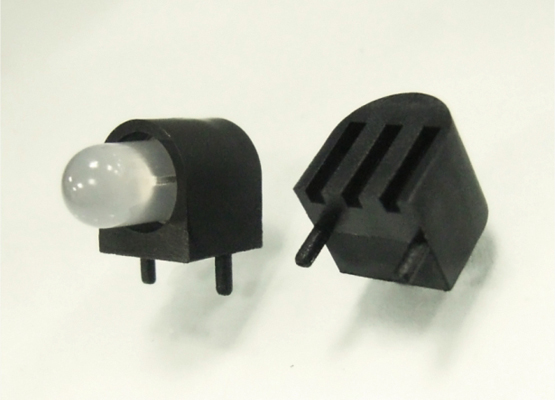 LED Support PA66 Right Angle PCB Mount for a 3 lead LED size 5mm(T-1¾). with 2 Centerpins. Centerline 4.5mm. The 2 Centerpins avoid the holder from turning and relieves the stress on the leads of the LED . LED’s shown for Demo not included in holder