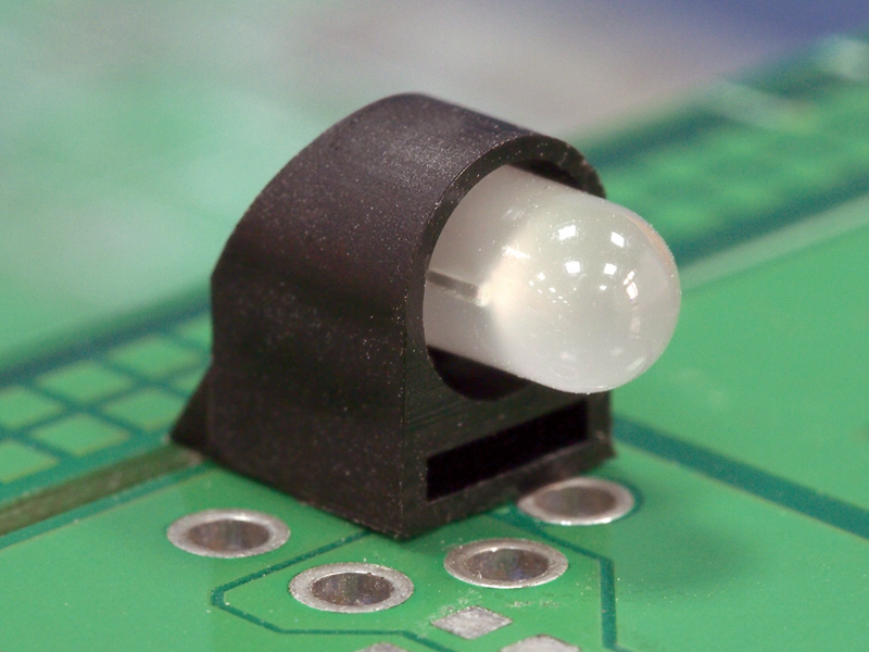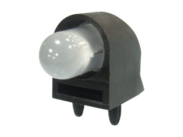 LED Support PA66 Right Angle PCB Mount for a 3 lead LED size 5mm(T-1¾). with 2 Centerpins. Centerline 6.05mm. The 2 Centerpins avoid the holder from turning and relieves the stress on the leads of the LED . LED’s shown for Demo not included in holder