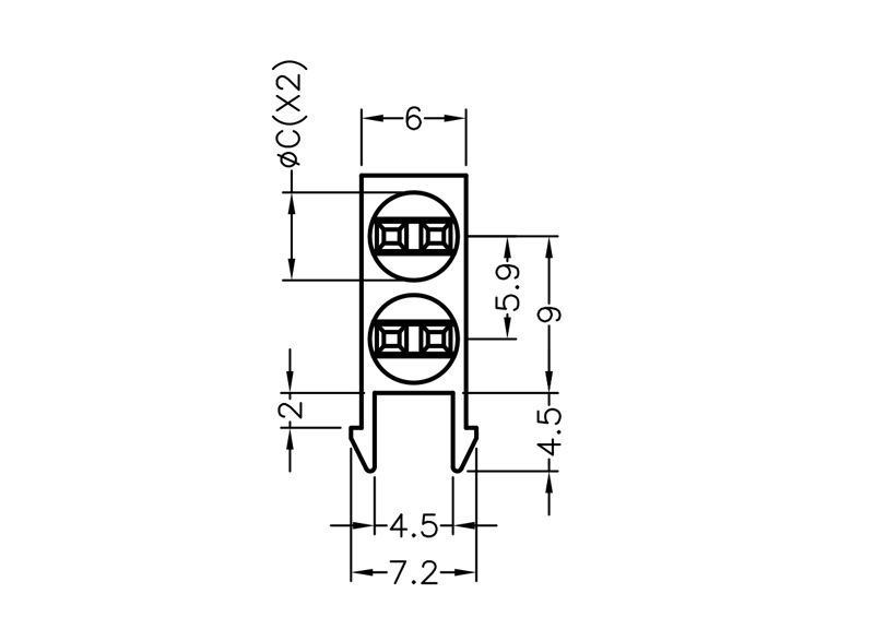 Right Angled vertical 2 stack LED holder for size 5mm(T-1¾) LED with 2 Locking pins. Centerline bottom LED 3.1mm. Centerline top LED 9.4mm. The Locking Pins keep the holder firm and relieves the stress on the leads of the LED. LED’s shown for Demo not included in