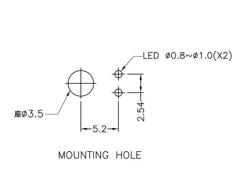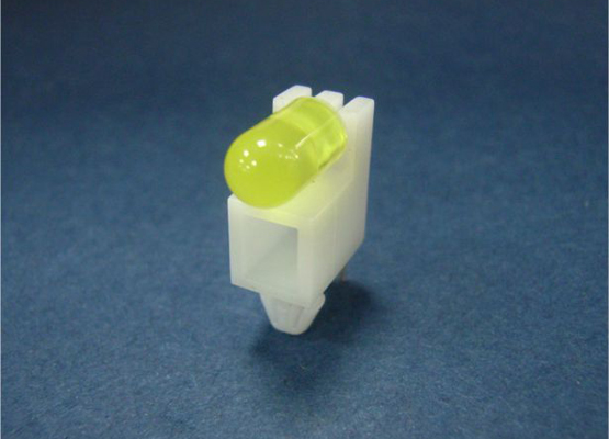 LED Support POM Right Angle PCB Mount for LED size 5mm(T-1¾) with Arrowhead for holesize Ø3.5mm. Centerline 7.5mm. The Arrowhead keeps the holder in place and relieves the stress on the leads of the LED . LED’s shown for Demo not included in holder