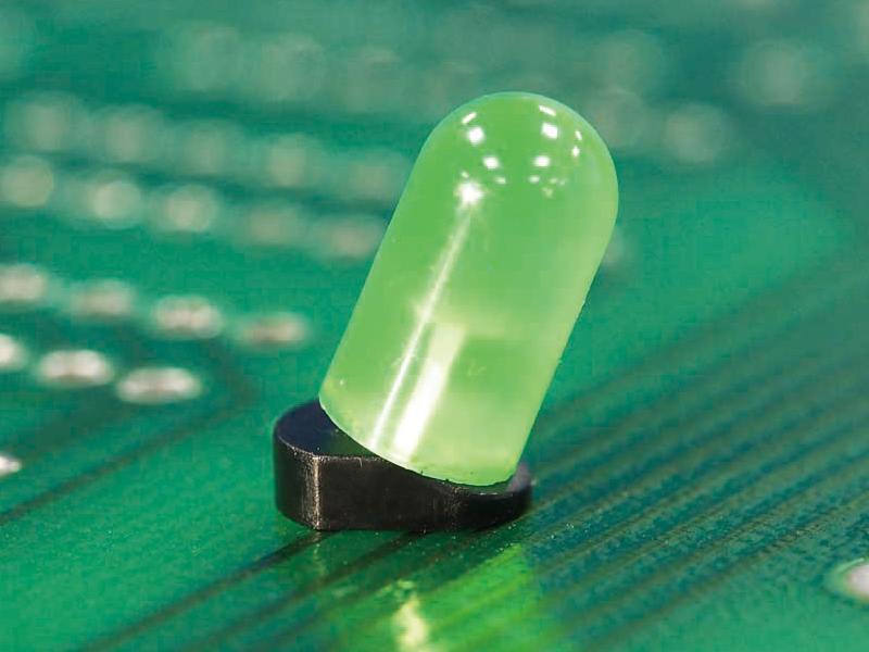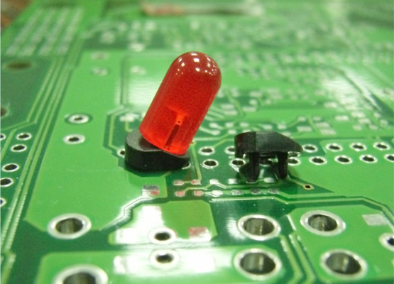 LED Support PA66 155 degree angle PCB Mount for LED size 5mm(T-1¾). with 2 Centerpins. The 2 Centerpins avoid the holder from turning and relieves the stress on the leads of the LED . LED’s shown for Demo not included in holder