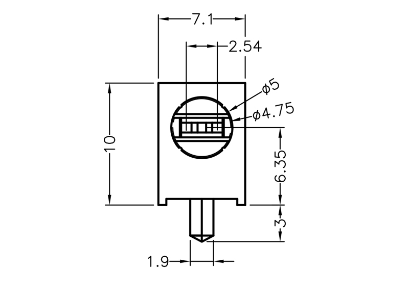 LED Holder PA66 Right Angle PCB Mount for LED size 5mm(T-1¾) with Centerpin. Centerline 6.35mm. The Centerpin keeps the holder in place and relieves the stress on the leads of the LED . LED’s shown for Demo not included in holder