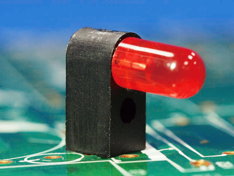 LED Holder PA66 Right Angle PCB Mount for LED size 5mm(T-1¾) with 2 Centerpins. Centerline 3.0mm. The 2 Centerpins avoid the holder from turning and relieves the stress on the leads of the LED . LED’s shown for Demo not included in holder